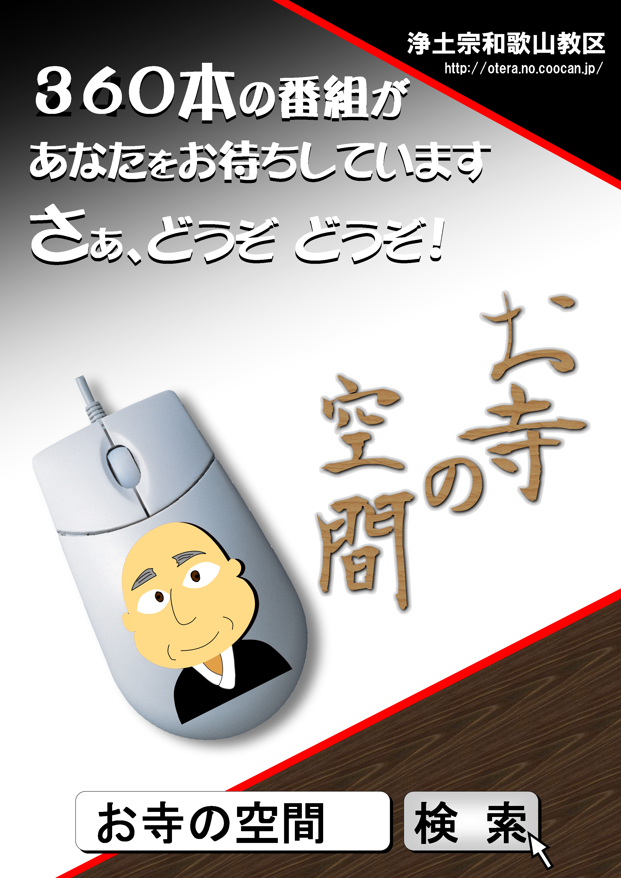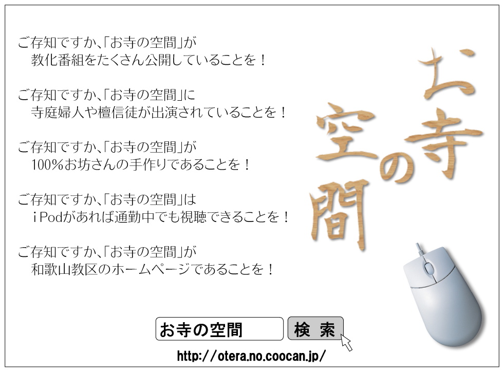 和歌山教区の一般向けホームページである「お寺の空間」の宣伝を、寺報等で行って頂くためのサンプル記事です。ご活用して頂ければ幸甚です。 |
